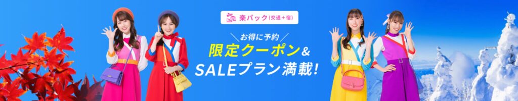 楽天トラベルを使うと公共交通機関と宿のセットがお得になる限定クーポンもあるのでおすすめです。