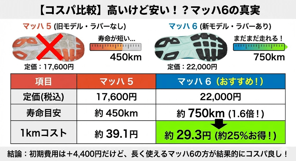 - ホカオネオネのマッハ 6は定価17,600円もするから、絶対に損をしたくない!