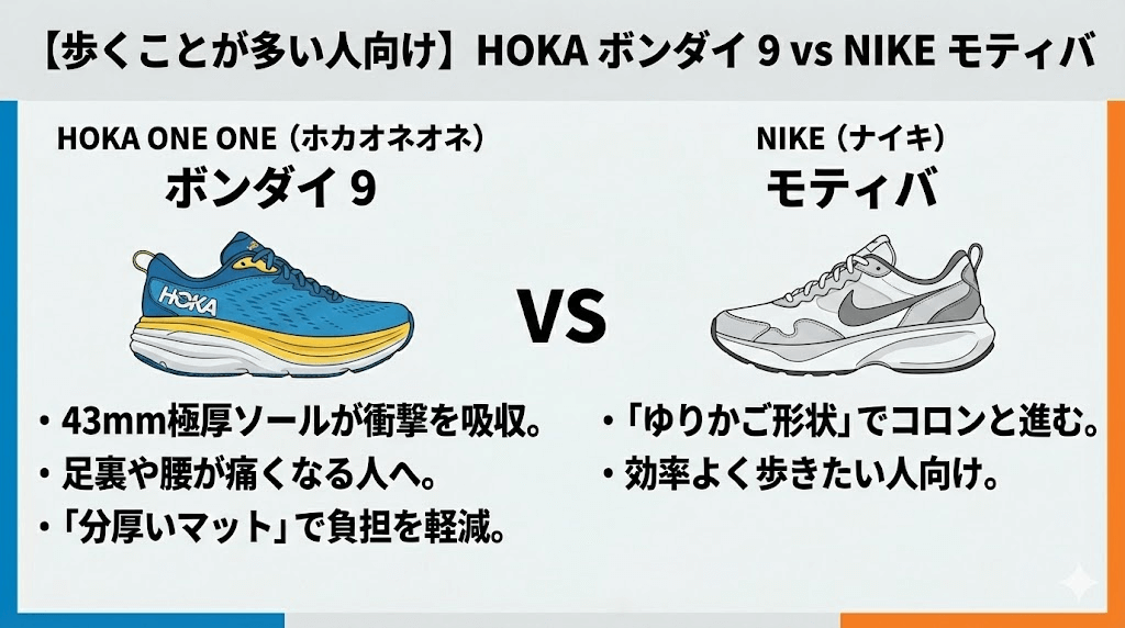 歩くことが多い人向け:モティバ (Motiva)VS ホカオネオネ(ボンダイ 9)との比較