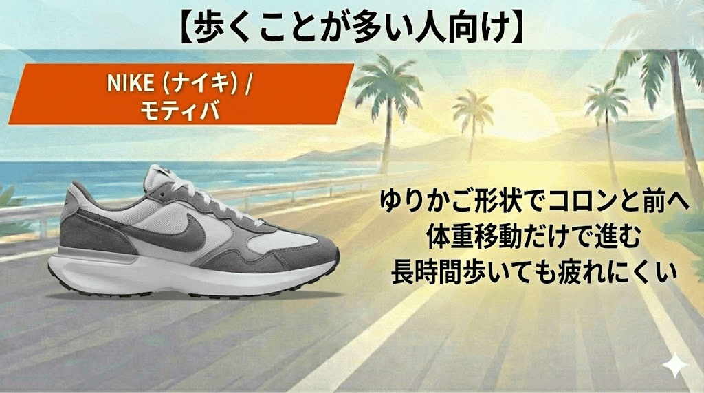 ただ柔らかいだけでなく、歩くスピードをスムーズに保ちたいなら、足運びを助けるナイキのモティバがです。