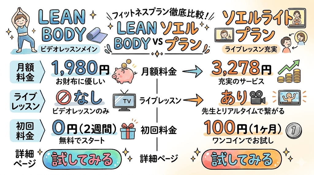 | 違い | LEAN BODY 1,980円/月 | ソエルライトプラン 3,278円/月 |